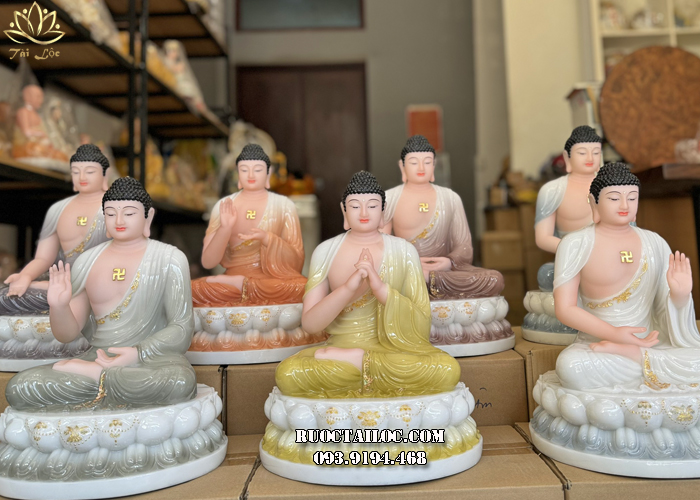 Bộ tượng 7 vị Phật Dược Sư bằng bột đá màu khoáng, y áo viền vàng diện đẹp, trang nghiêm